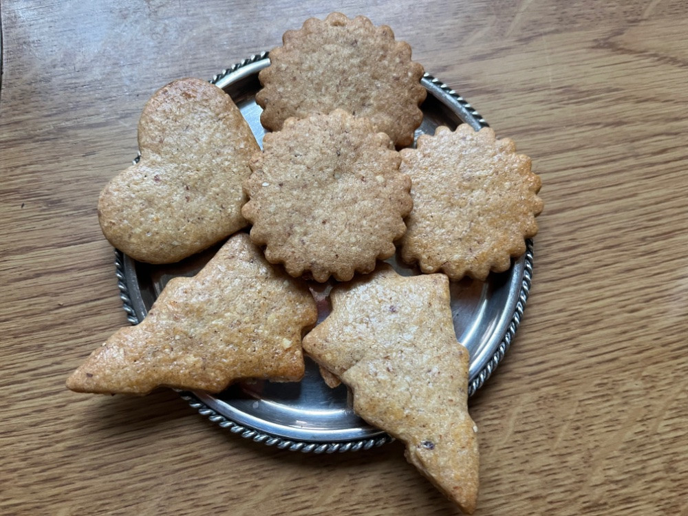 Alles zu einem glatten Teig verkneten, in Frischhaltefolie einschlagen und für mindestens 1/2 Stunde kühlen. Ich habe anschließend aus dem Teig eine Rolle geformt und Scheiben von etwa 3 bis 5 mm abgeschnitten. Man kann den Teig natürlich auch entsprechend dick ausrollen und Formen ausstechen. Die Kekse auf ein mit Backpapier ausgelegtes Blech legen. Den Backofen mit Umluft auf 170° C vorheizen und die Kekse auf der mittleren Schiene ca. 5 Minuten backen. Danach den Backofen auf 180° hochschalten und weitere 5 Minuten bei Ober- und Unterhitze backen, ein bisschen beobachten, die Kekse sollen nicht bräunen.