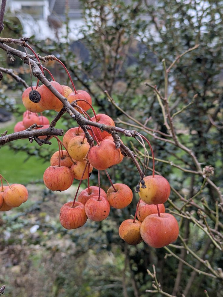 Ich vermute die Zieräpfel die ich in der Stadt gesehen haben waren dann wohl eher auch Evereste dort stehen sie sehr frei kann mir vorstellen das Wärmemenge + Lichtmenge durch den Beton dort etwas erhöht ist und der Everest dadurch im Stadtklima vllt doch eher einen Rotton annimmt, auch der Fruchtbehaang war dort noch recht reichlich, das Stadtklima puffert ja spätfröste etwas ab.