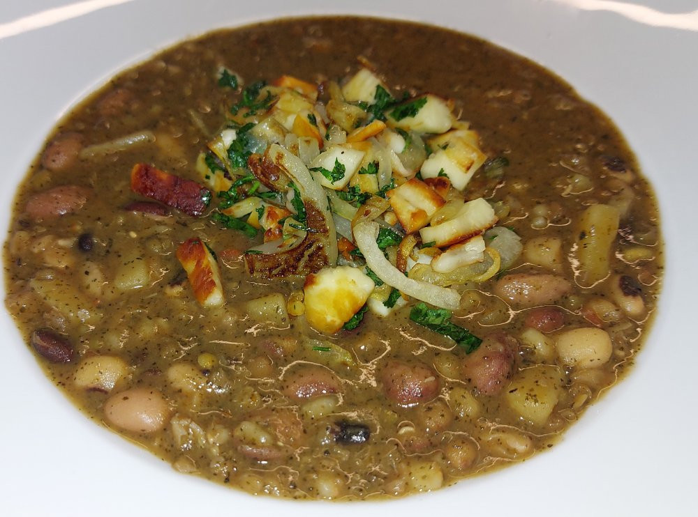 Nun habe ich mich drangewagt und eine Suppe gekocht. Und siehe da, nach einer Stunde waren alle Hülsenfrüchte gar, einige zerkocht, und die Suppe hatte eine tolle Konsistenz :P