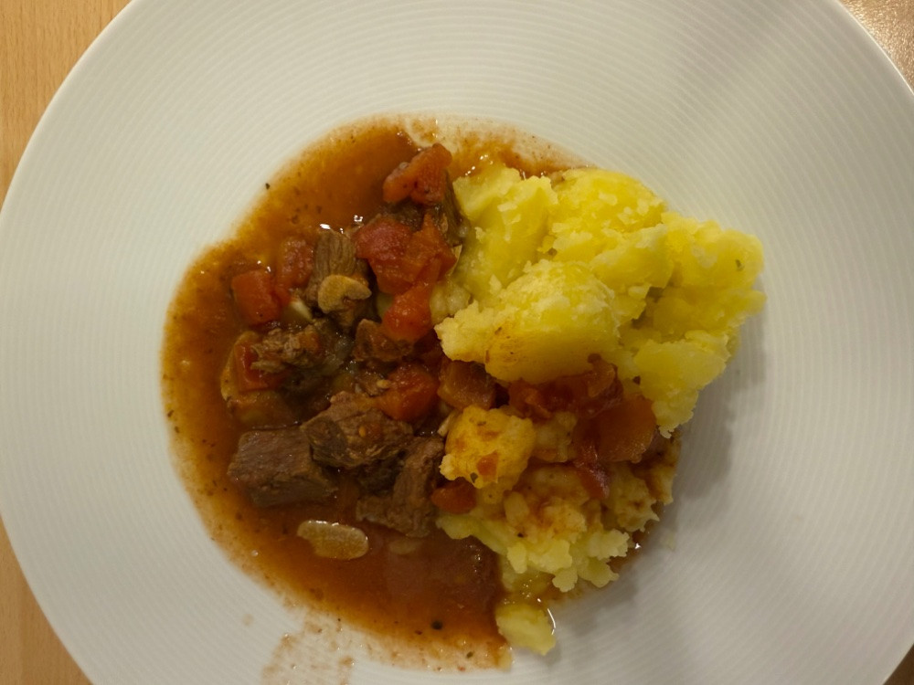Bei uns gab es „RinderGulasch“ Slow Cook 5 Stunden gekocht und sehr zart, dazu Salzkartoffeln. Mehlig kochend, Nemo. Und Salat