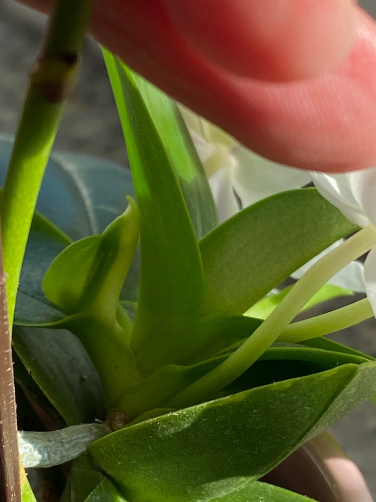 Meine Kuriositätenorchidee hat sich entschieden zwei Blütentriebe zu schieben und das neueste Herzblatt entfaltet sich nicht ???
