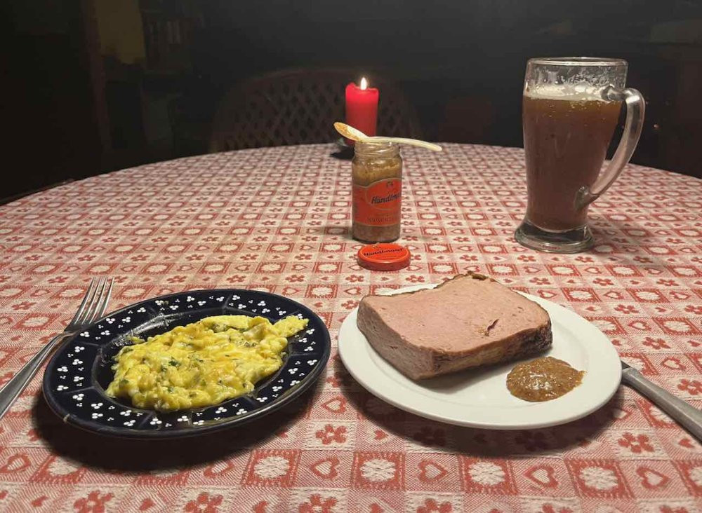 Haute Abend Hauptgerichte Neuburger gedämpft und Rührei mit Schnittlauch zum dunklen Oettinger Weißbier, Nachspeise Pustertaler Schnittkäse zum "Zickencuvee" 2023 aus dem Remstal