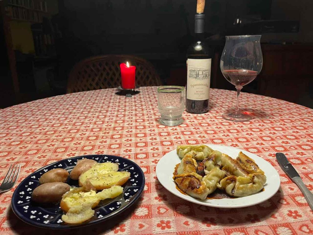 Hauptgerichte Edamame (japanische Jiao zi mit Sojabohnen) mit Sojasoße sowie rotschalige Kartoffeln gedämpft und mit Butter und Oregano serviert zum Bio-Wein "Rosso Toscano" 2021