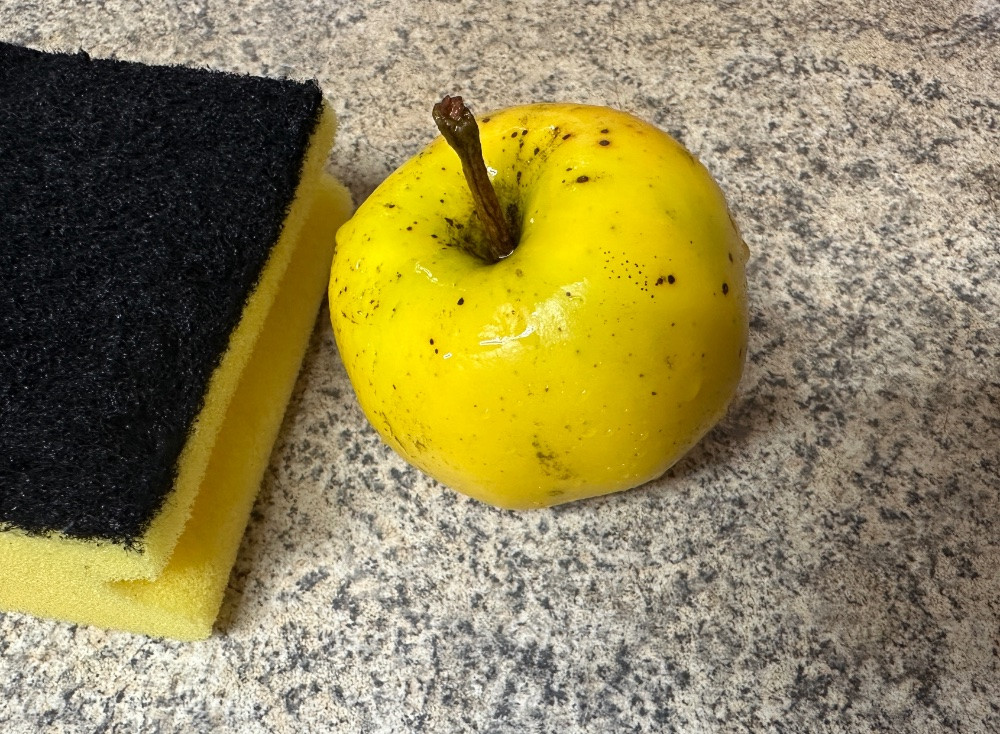 Weil es ungern ausprobiert wird, hier im Bild, was man erreicht wenn man Äpfel wäscht wie oben beschrieben. Es wurde auch nicht lange oder schwer dran rumgerubbelt. Es geht leicht, wenn man eine Schüssel mit solchen Äpfeln zehn Minuten einweicht. Der Apfel liegt in Bild 1 und 2 in derselben Position. Man sieht, dass Regenfleckenkrankheit zu 90% weggeht, die Fliegenschmutzkrankheit nur zu 20%. Aber die stört optisch nicht so. Wo nichts weggeht, ist natürlich in der Stielgrube.