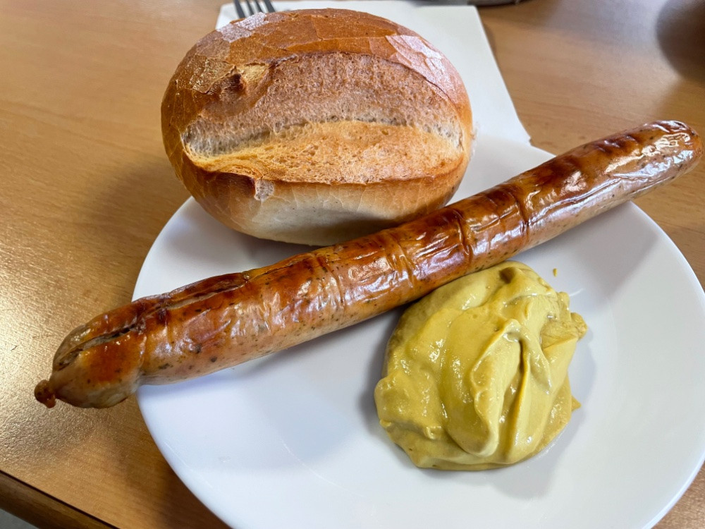Achtung Kontrastprogramm: Thomas und ich hatten gestern eine kleine Heißhungerattacke als wir durch ein Gewerbegebiet gefahren sind. Beim Imbiss habe ich mir dann eine Bratwurst geholt. Man beachte unbedingt die monströse Senfportion!