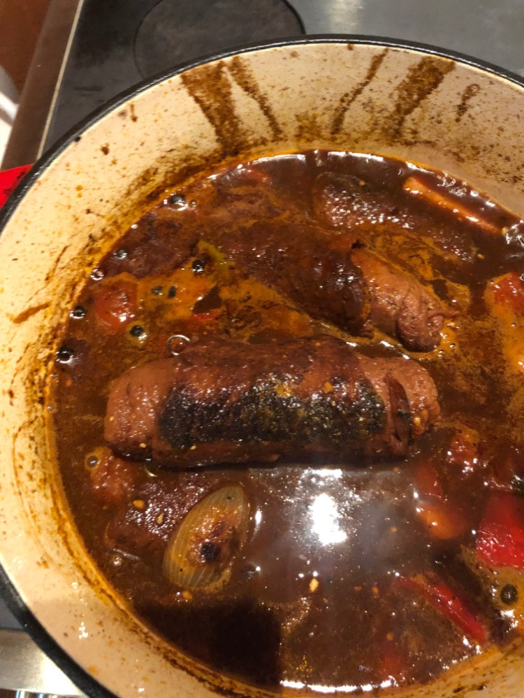 Hier schmoren die vorbereiteten veganen Rouladen, wer es nicht weiß