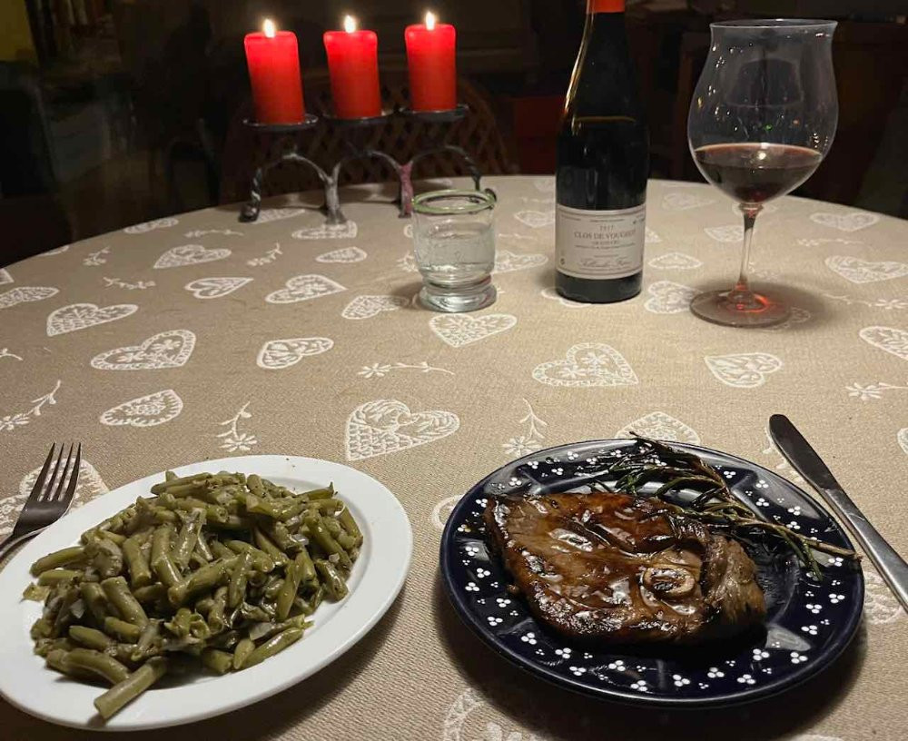 Lammkotelett, mariniert mit Knoblauch, Rosmarin, Thymian, Oregano, Kreuzkümmel, Zimt, Olivenöl und etwas Zitronensaft, scharf kurz angebraten, mit Rotwein abgelöscht und mit Teriyakisoße und Schalotten fertig gebraten sowie Brechbohnen mit Schalotten und Thymian zum Burgunder Clos de Vougeot Grand Cru 2017