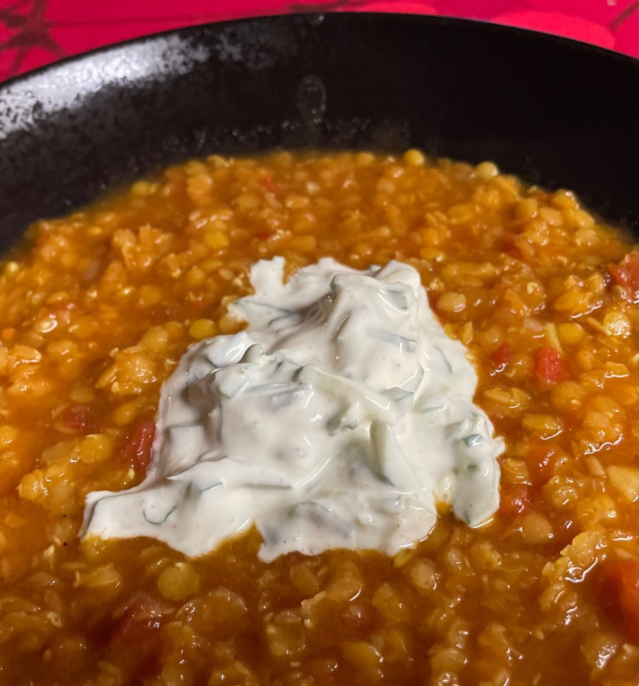 Bei uns gab es heute rote Linsensuppe mit Raita. Eigentlich auf Joghurtbasis, aber der war nicht da und deshalb Creme fraîche, saure Sahne und Gurke und Minze.