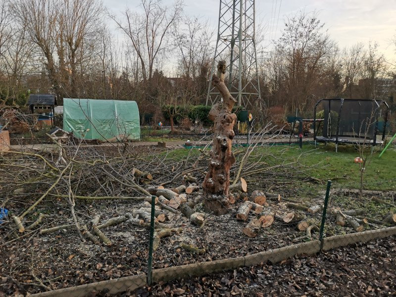Obstbäume ist gerade auch das Thema, einige geschnitten, allein gestern 26, heute mal ein Tag Pause, damit die Schulter nicht weh tut. Deshalb mit der Kettensäge den Baum ein paar Beiträge weiter vorne abgebaut. Das sind jetzt ein paar Schubkarren fertig abgelängtes Brennholz. Die müssen noch aus dem Garten raus.