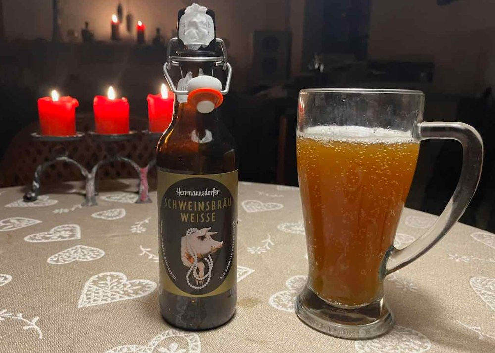 Kabanossi, mit Schalotten in Butterschmalz gebraten, und schnelle Bratkartoffeln mit Zwiebeln und Kümmel zum Schweinsbräu Weißbier aus Hermannsdorf