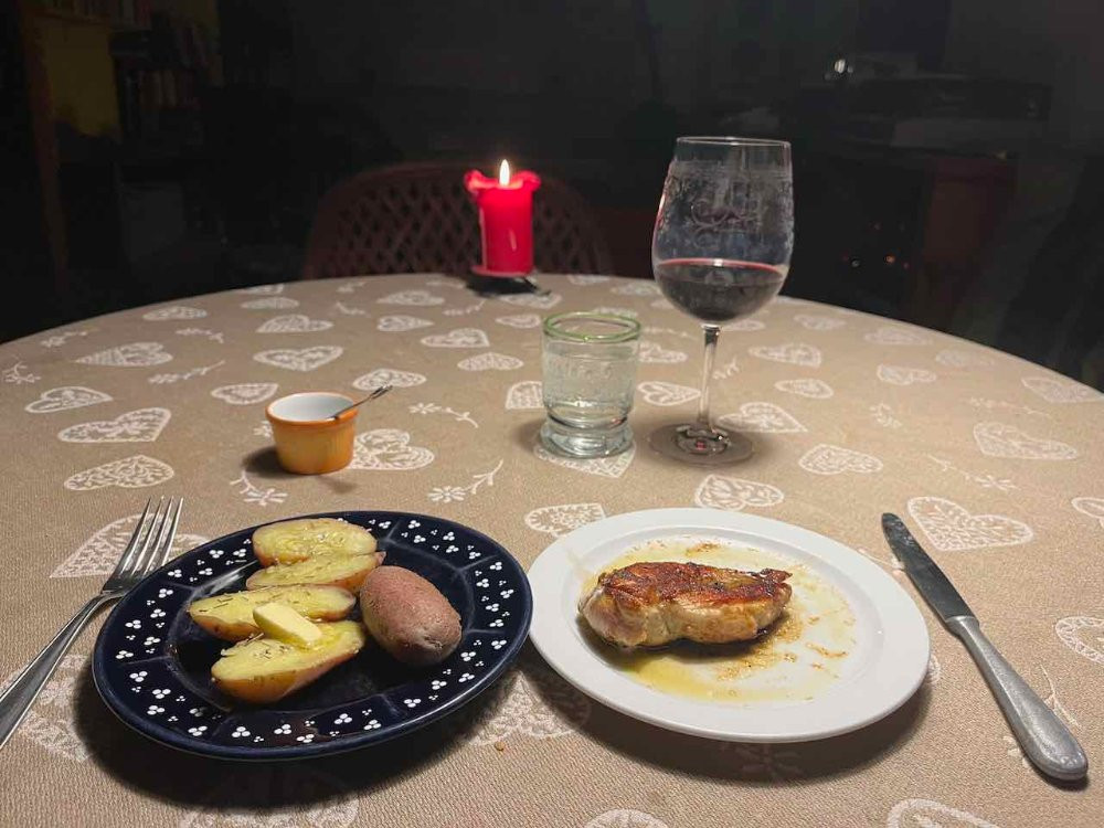 Thomas und ich haben uns heute ein Stubenküken geteilt. Dazu gab es wilden Broccoli, Knoblauchzehen und Kartoffeln, die mit im Ofen geschmort haben. Und auch noch total verkochten mit Brühe zubereiteten Reis.