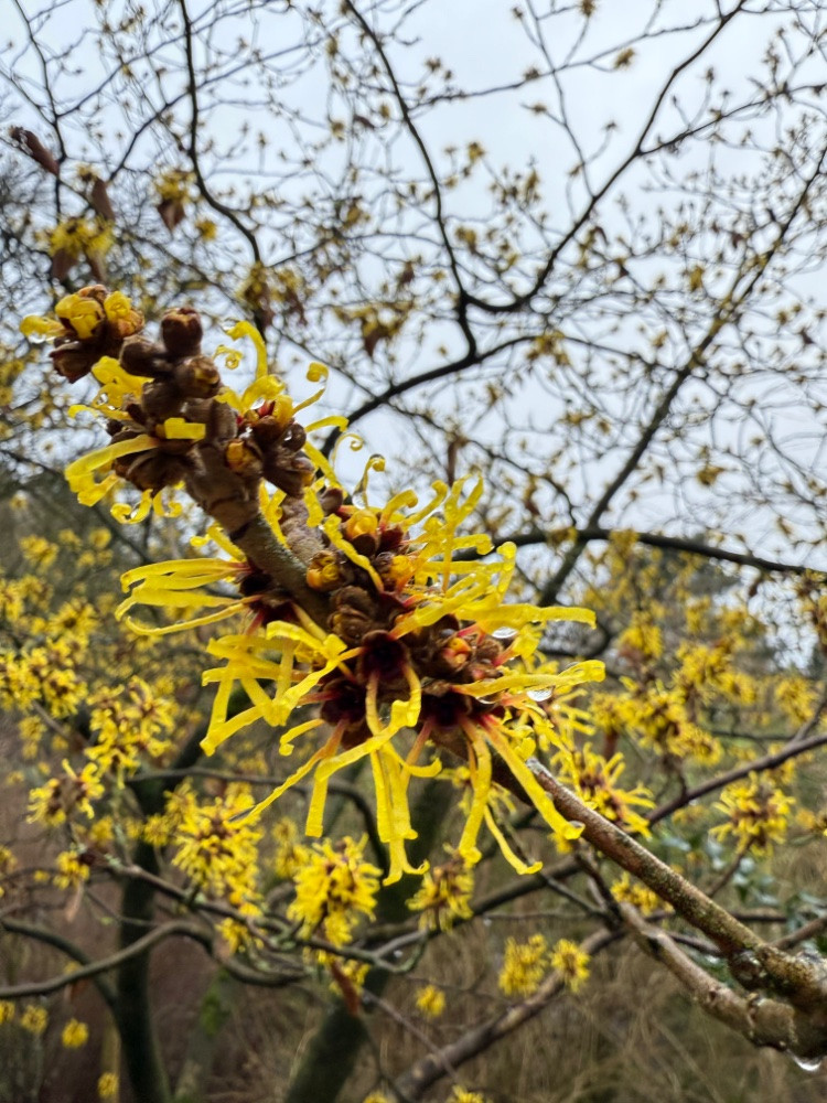 Obwohl der Winter in diesem Jahr bisher sehr mild war, sind die Hamamelis noch arg zurückhaltend. Diese H. pallida zeigt ein erstes Lebenszeichen.