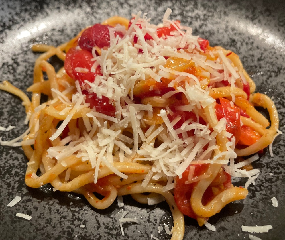 Doradenfilet, asiatisch mariniert und über Sherryschorle gedämpft sowie Trofiette aglio e olio zum Rkatsiteli 2018 aus Georgien