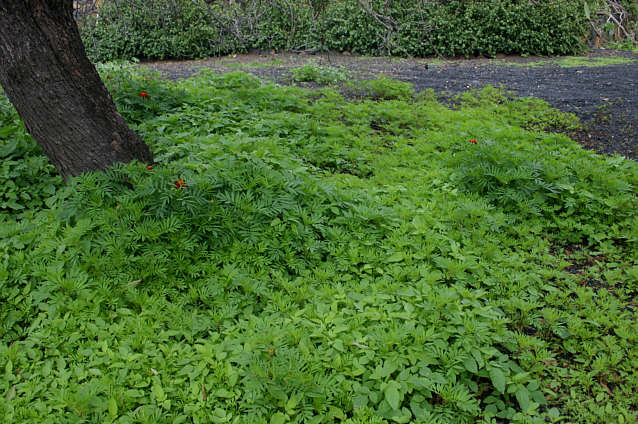 Unter diesem Baum wuchsen Tagetes und dann samten sie aus und das viele Grün sind alles Tagetes-Sämlinge. Beneidenswert