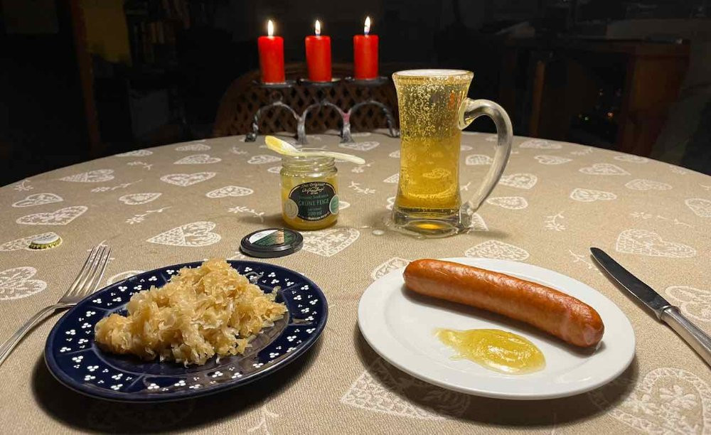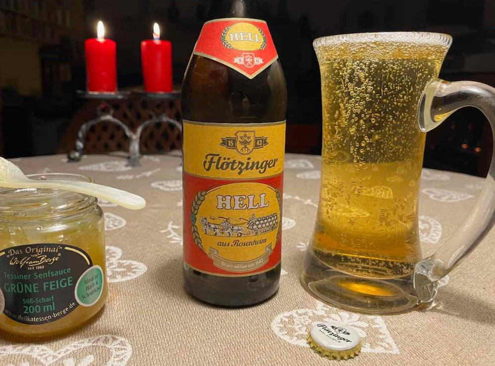 Bayerische Brühpolnische gesotten und mit Tessiner grünem Feigensenf sowie Sauerkraut asiatisch mit Sojasoße und Sesamöl gedämpft zum Flötzinger Hell aus Rosenheim
