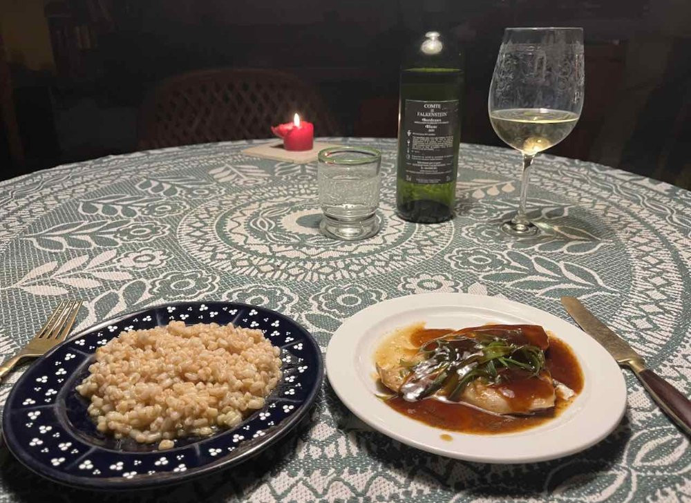 Doradenfilet, asiatisch mit Sojasoße, Ingwer und Knoblauch mariniert und über Sherryschorle mit Lauchzwiebeln gedämpft sowie Dinkelreis mit Gemüsebrühe und etwas Butter gedämpft zum weißen (!) Bordeaux