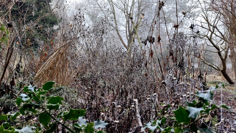 Ich bin ganz froh, dass ich "zwischen den Jahren" schon einiges herunterschneiden konnte, das verschafft mir den entscheidenden Vorsprung im zeitigen Frühjahr, wenn die Gartensaison hier im Weinbauklima schon sehr zeitig losgeht. Nur das Beet am Hang ist noch ein ziemliches Chaos von plattgedrückten Stauden, da kann ich aber nur aufräumen, wenn's mal wirklich trocken ist, und da ist im Winter leider eine Seltenheit. Im Moment deckt der Schnee alles gnädig zu, ich hoffe, nächstens Jahr wachsen die Stauden hier wieder aufrechter, nachdem ich drei große Äste der Haselnuss entfernt habe, die für allzu viel Schatten in diesem Bereich gesorgt haben.