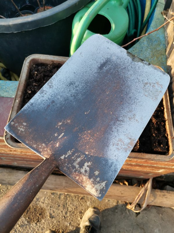Gute Idee. Im Frühjahr brauche ich nur selten einen Spaten. Gemüsebeet ist umgegraben, das wird mit Rechen/Harke oder Krail nur noch glattgezogen, Bäume sind gepflanzt, Spaten sauber. Mit den Händen eingefettet, also Fett und weil es kalt war nur wenig Fingerschweiß. Hat die letzten Jahre auch gegen Flugrost geholfen und schont die Ballistolflasche.