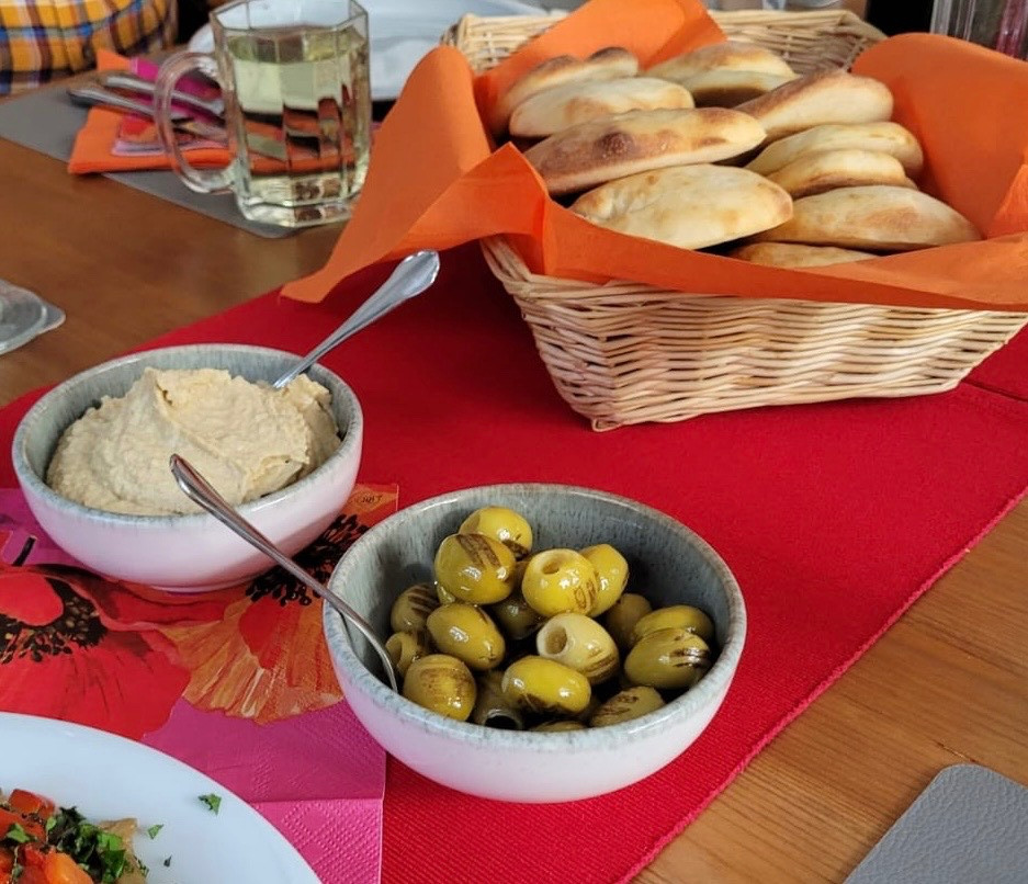 Es gab Grillgemüse ( Melanzani/ Tomatensauce/ Paprika) mit Minze, Hummus, Oliven, Köfte und Fladenbrot.