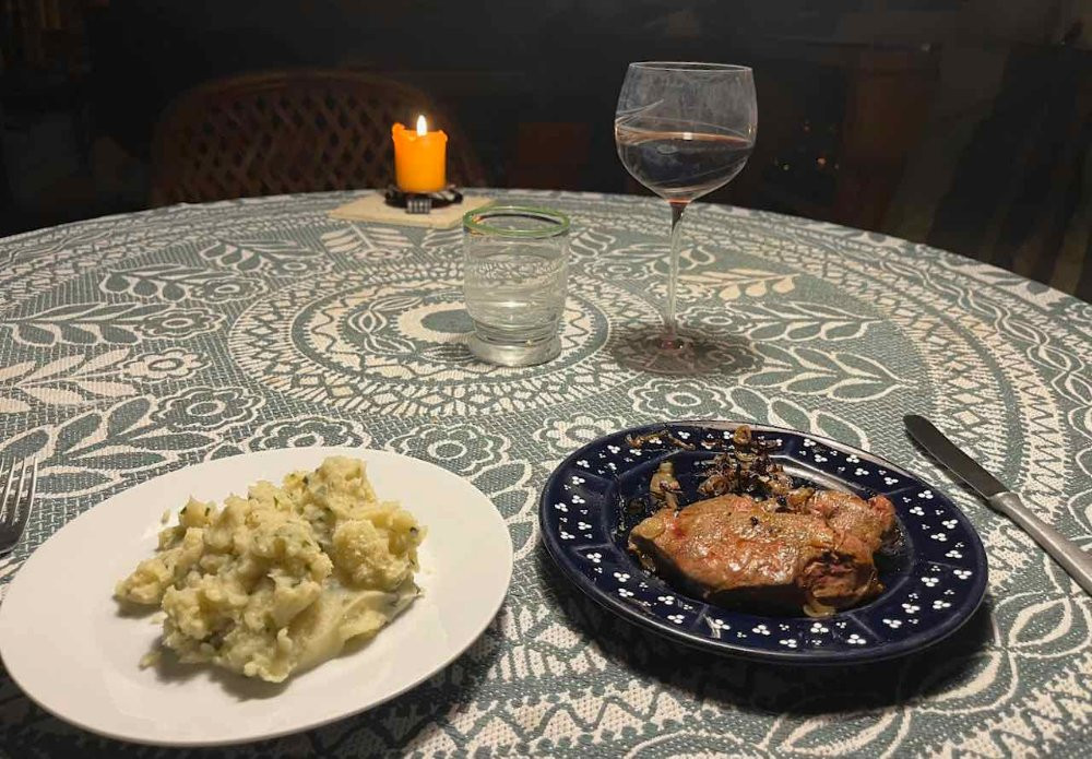 Fegato alla Venezia sowie Kartoffelpüree mit Schnittlauch zum Amarone della Valpolicella classico 2013 "Puro". Ich wollte eigentlich Leber mit Salbeibutter machen, aber der war noch eingeschneit.
