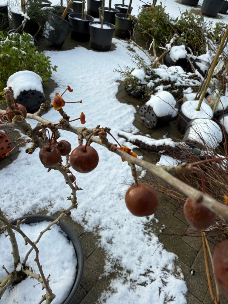 Die festeren Sorten wie 'Red Sentinel ' oder ' Evereste' bleiben genau deshalb länger am Baum, weil sie härter sind als z.B. 'Butterball' ( der Name sagt es schon). Bei diesen harten Sorten braucht es erst ordentlich Frost, damit sie mürbe werden und für Vögel attraktiv. Für uns bleibt der Fruchtschmuck dafür länger erhalten.