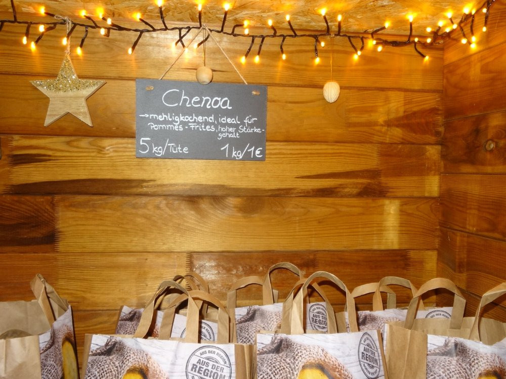 Mia ist ausverkauft. Ich habe eine Tüte probiert, und sie ist, wie es im Handel so schön heisst, "vorwiegend festkochend". Also halte ich mich an die vorhandenen Sorten. Leider war der Landwirt gestern nicht da, sonst hätte ich ihn gefragt. Das ist ein sehr kommunikativer Typ.