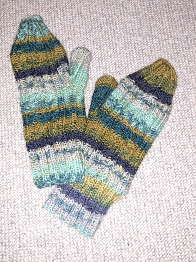 . Keiner von uns hat Fäustlinge im Vorrat. Also hab ich kurzerhand ein einfaches Fausthandschuhstrickmuster rausgesucht und mich beeilt. Ist ja grad wieder kälter geworden