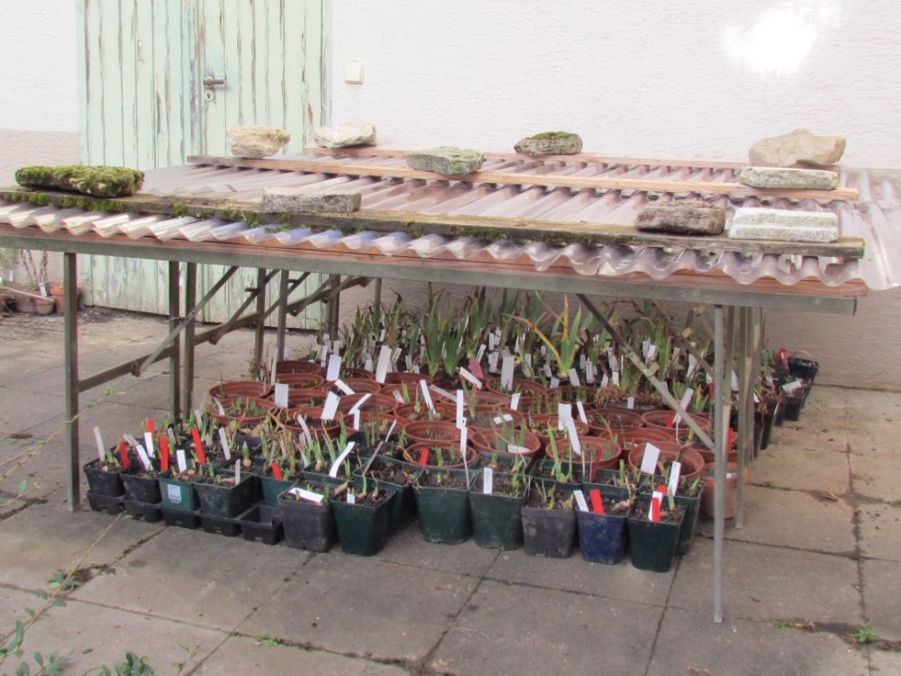 Vorletzten Winter hatte ich getopfte Rettungsiris daher in einer Art Gartenhütte überwintert. Getopft in eine Mischung aus Splitt, gewaschenem Sand und einer geringen Menge Blumenerde hatten sie dort, regensicher aber relativ dunkel, auch gut den nassen Winter überstanden. - Nässeschutz scheint tatsächlich das Elementarste zu sein.