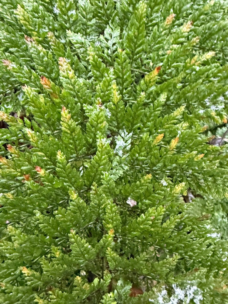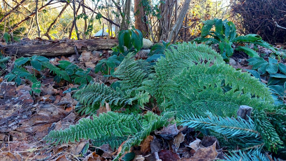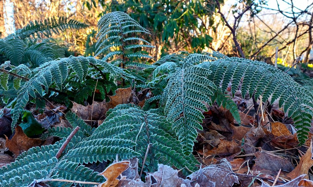 Wintergrüne Farne und Frost --- > jap. Glanzschildfarn / europäischer Glanzschildfarn / Flaumfederfiligranfarn