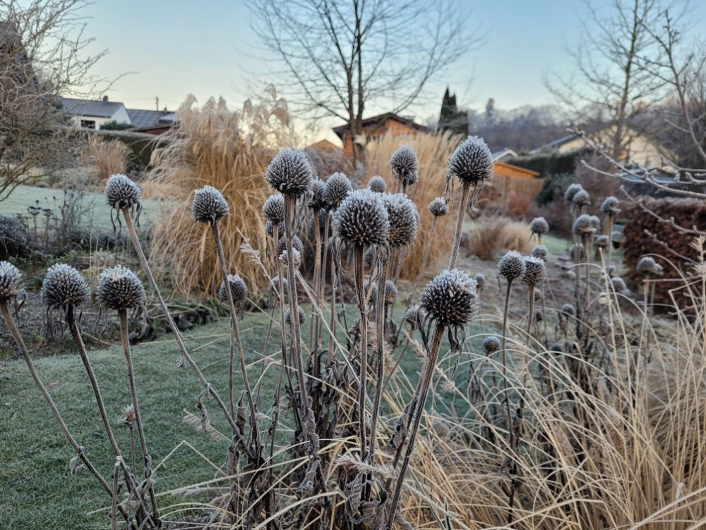 Jede Menge, würde ich sagen! Etliche Samenstände von Rudbeckia, Echinacea, Phlomis, Agastache, Liatris, dazu Sedum und die ganzen Gräser! Ich staune sehr, dass der Schnee der letzten Tage da nicht mehr plattgedrückt hat. Hier im Garten steht nun so gut wie gar nichts mehr aufrecht. Rudbeckia ist völlig von den Distelfinken abgeerntet worden, die Gräser fangen an, ihre Halme abzuwerfen. Selbst Miscanthus und Calamagrostis sind größtenteils umgeknickt und sehen nicht mehr sonderlich schön aus. Das alles scheint an Deinem Garten irgendwie vorbeigegangen zu sein, und auch wenn hier und da vielleicht etwas heruntergeschnitten werden musste, ist der Rest immer noch wunderbar anzuschauen.Buddelkönigin hat geschrieben: ↑13. Jan 2025, 10:47 Die Winterbeete im Morgengrauen im Detail... was ist überhaupt noch übrig![]()