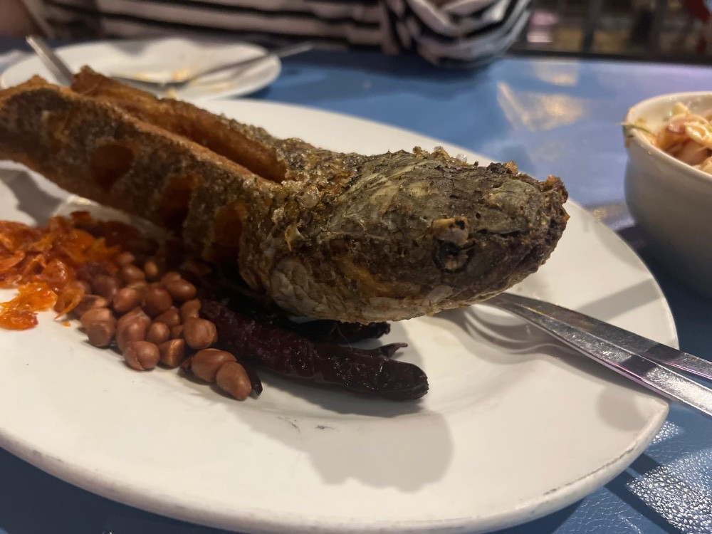 Zu diesem Flussfisch gab es als Beilage ein unglaublich leckere Sache aus Knoblauch, Chili, Zitronengras, Kaffirlimettenblatt, Limettensaft, Fischsauce und Zucker. Das werde ich auf jeden Fall nachmachen, aber mit viel viel weniger Chili. Wir konnten es leider kaum essen. Dabei hat es sooo gut geschmeckt. Die Menge vom Knoblauch zu diesem Fisch waren bestimmt drei Knoblauchknollen. :o