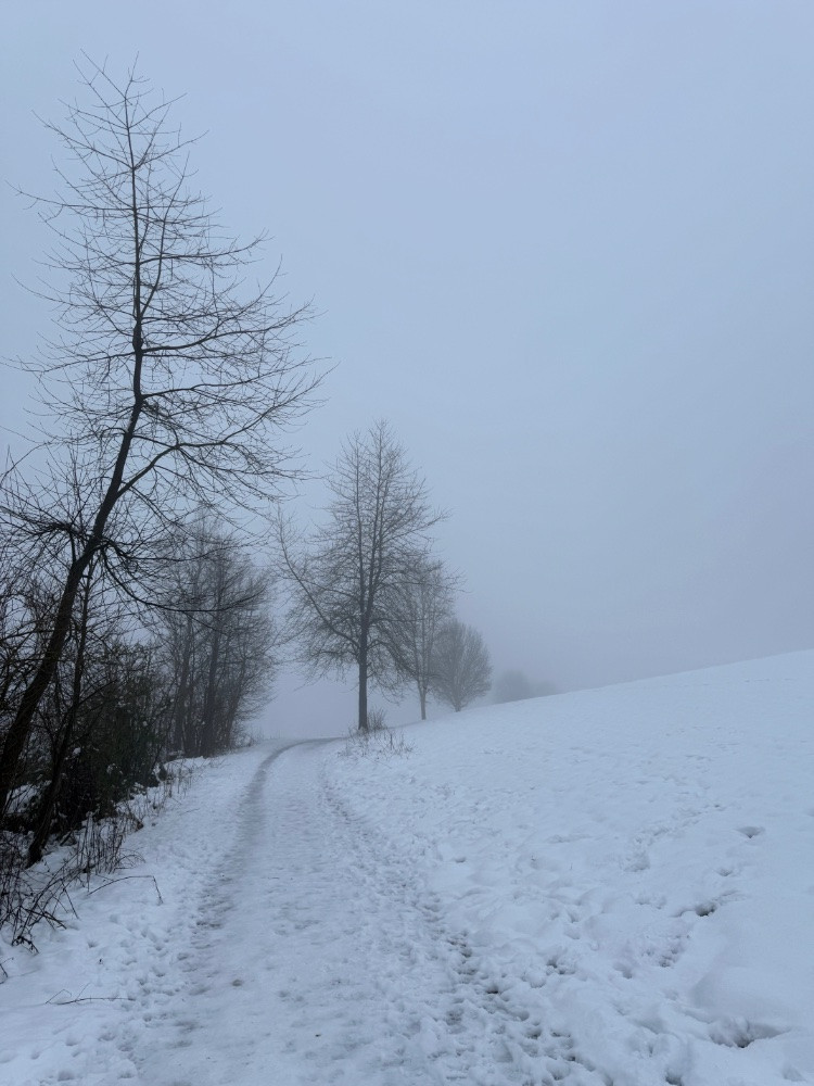 Hier ähnlich sehr neblig aber immerhin Temperaturen über null der Schnee schmilzt etwas aber alles ist extrem glatt selbst Kieswege
