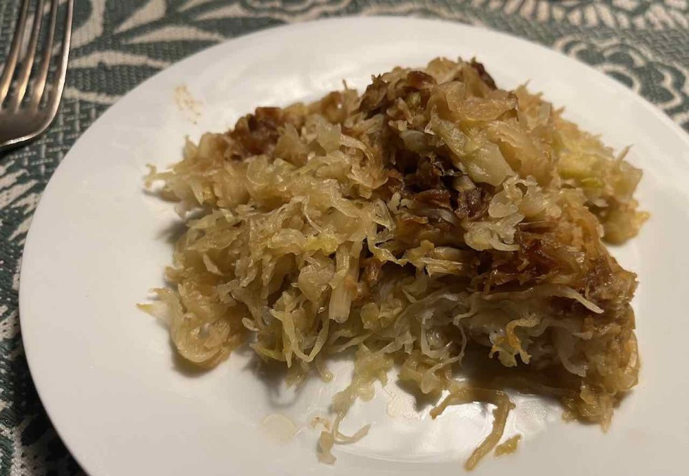 Martina, hier auch deftig und karnivor: Cabanossi, diesmal gebraten und mit Kren sowie Sauerkraut asiatisch mit Sojasoßen und Ingwer gedämpft zum Schweinsbräu Dunkel aus Hermannsdorf
