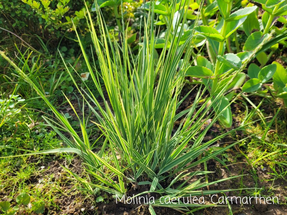Molinia caerulea 'Carmarthen' ist gelbgrün gestreift und der Horst bleibt mit 30cm niedrig.