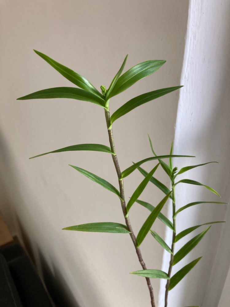 Es handelt sich auf jeden Fall um ein Dendrobium.Die Triebe sind maximal 3-4mm dick und sind an der Basis mit rotbraunen Tüpfeln gemustert. Kann mir da jemand helfen?