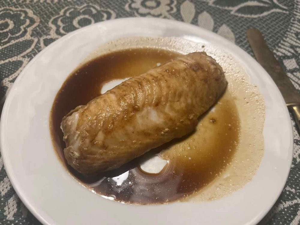 Schweineschulter im Cidre-Sahne-Soße mit Quittenspalten, Zwiebeln und dazu gab es Kartoffelklöße aus TK (war unser Essen am 24.12)
