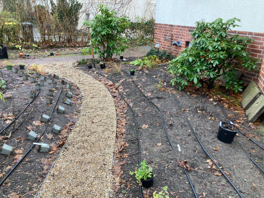 Deshalb hab ich in den engeren Passagen vor einem oder zwei Jahren Rasengittersteine eingebaut, da kann man zumindest vernünftig laufen. Wie lange das geht und ob die irgendwann versinken, weiß ich nicht. Es gibt ja auch diese Rasengitter aus Plastik, aber weiß nicht, ob die was taugen und lange halten. Ich möchte später dann nicht tausend Plastiksplitter im Boden haben und Mikroplastik versuche ich eigentlich auch zu vermeiden.