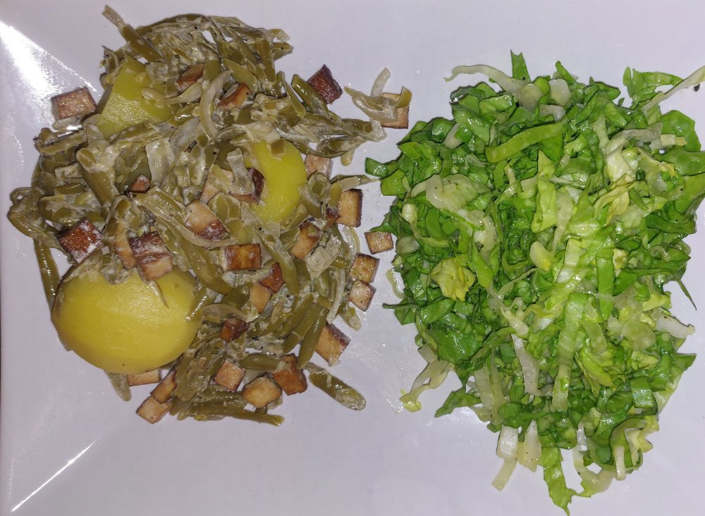 Kartoffeln mit sauren Bohnen und Räuchertofu, Endiviensalat
