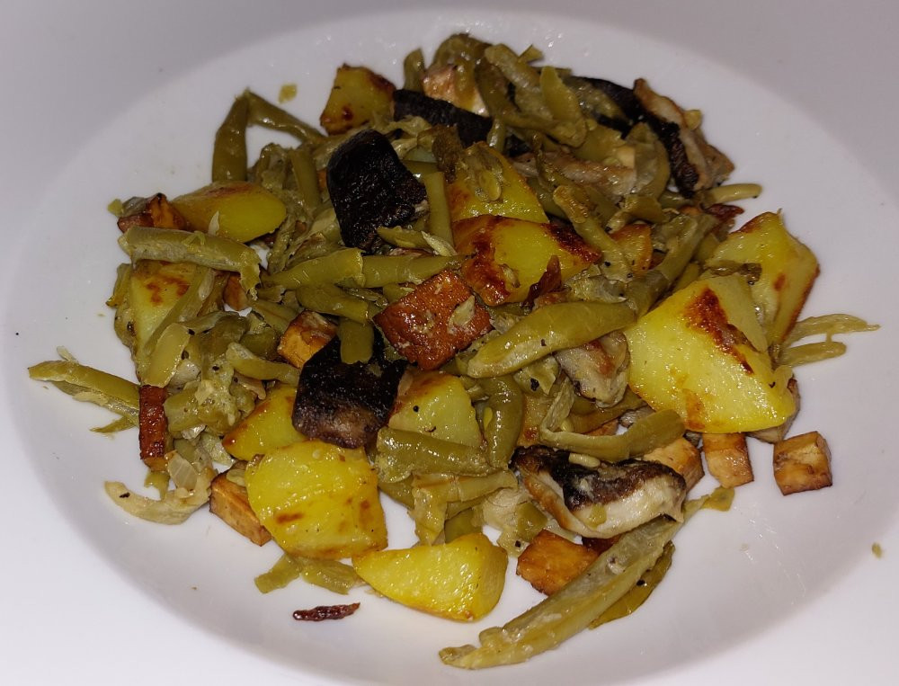 Heute gab's die zweite Hälfte der sauren Bohnen mit gebratenen Kartoffeln und Pilzen
