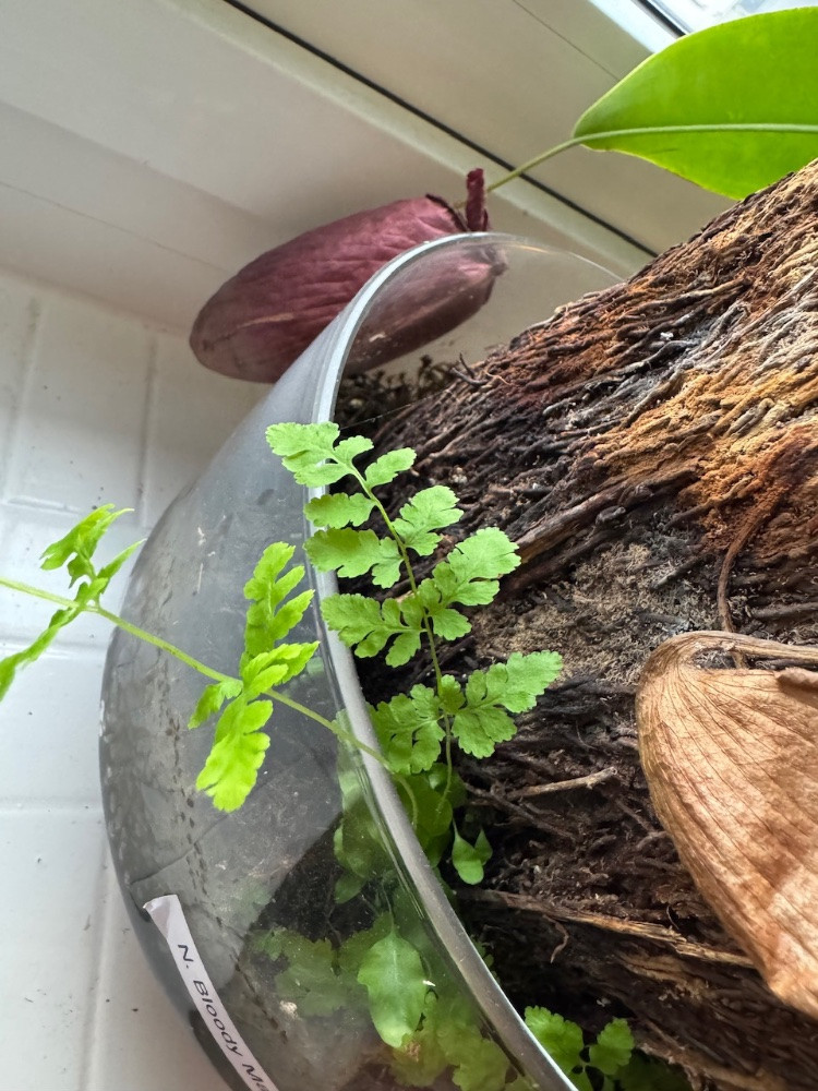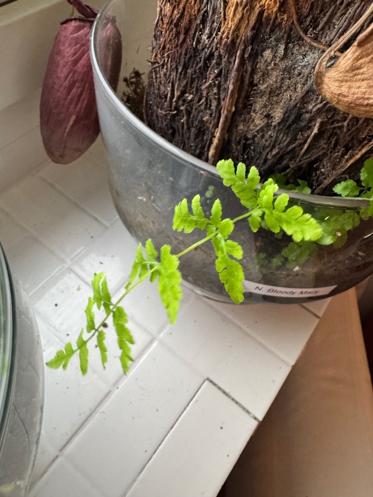 Der Tarantelfarn hatte mal ca 20 cm lange Wedel, dann ging es ihm nicht gut, alles trocknete ab und jetzt erscheinen die ersten kleinen Blätter. Irgendwo habe ich gelesen, dass sich die Rhizome von abgestorbenen Rhizomen ernähren. Er mag auch nur Tauchbäder und kein Gießen, aber das Besprühen der Rhizome schätzt er.