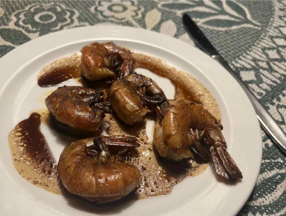 Argentinische Rotgarnelen, asiatisch mariniert und gebraten sowie Safranrisotto zum "La Morande" aus der Gascogne