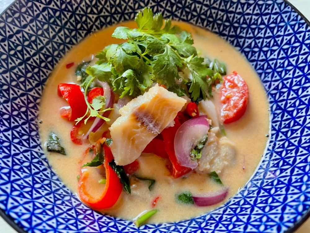 hier heute zum mittagessen ganz schnell und ohne reis thaicurry mit fisch und thailändischen kräutern – grüße nach bangkok!