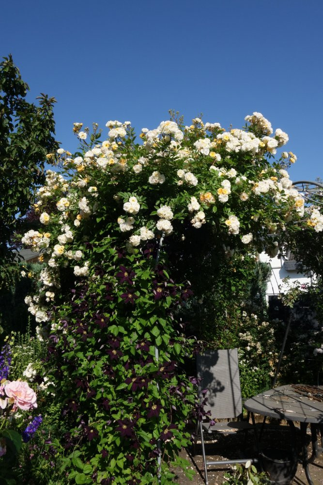 Dann lege ich mal die Ghislaine am Pavillon an. Clematis und Rittersporn sind auch dabei.