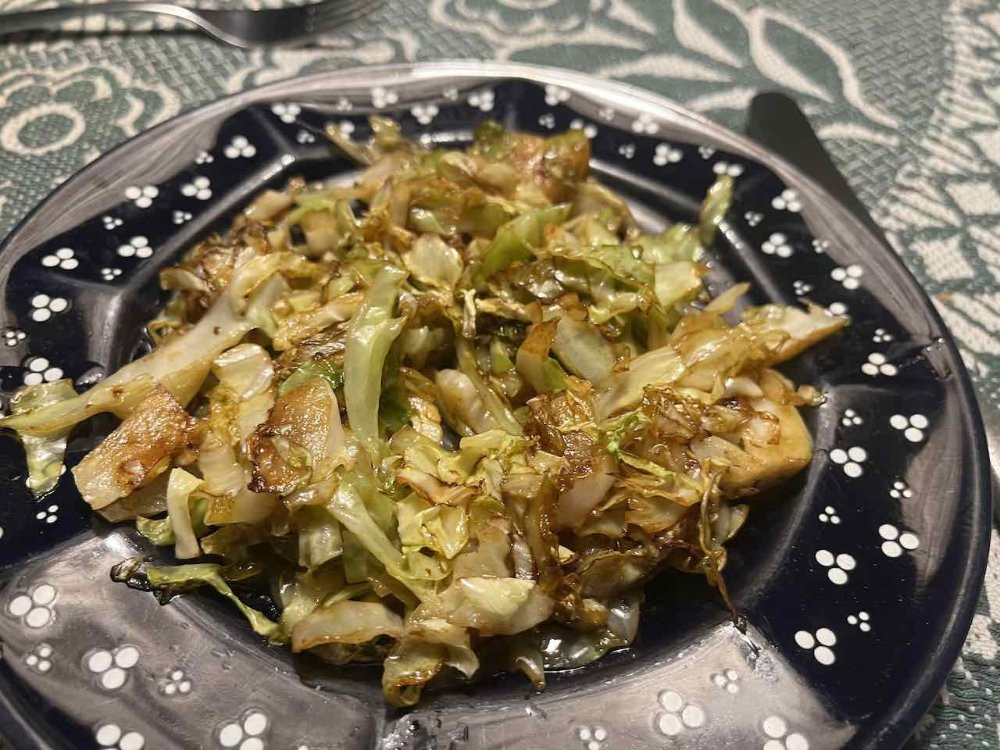Spitzkohl mit Meersalzbutter und Sojasoße gebraten und schnelle Drillings-Bratkartoffeln mit Schalotten und Kümmel zum Margaux 2016 aus dem Bordeaux