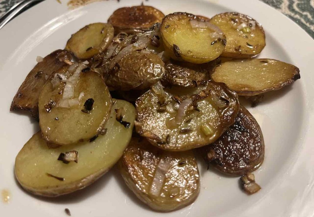 Spitzkohl mit Meersalzbutter und Sojasoße gebraten und schnelle Drillings-Bratkartoffeln mit Schalotten und Kümmel zum Margaux 2016 aus dem Bordeaux