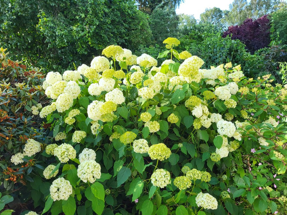 Abgesehen von der Hortensie sind Rhododendron , Rose ,Holunder , Haselnuss, Philadelphus, Kornelkirsche und auch Geranium zu sehen.