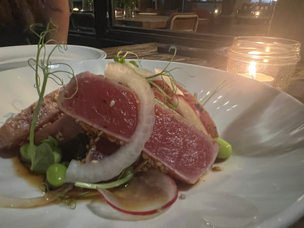 Gestern zuerst ganz kurz angebratener, innen roher Thunfisch, dann gebeizte Doraden (oder ähnlicher Fisch) in wunderschöner Präsentation, dazu Yoghurt-Sauce mit Dillöl und Yuzu-Tapenade ...