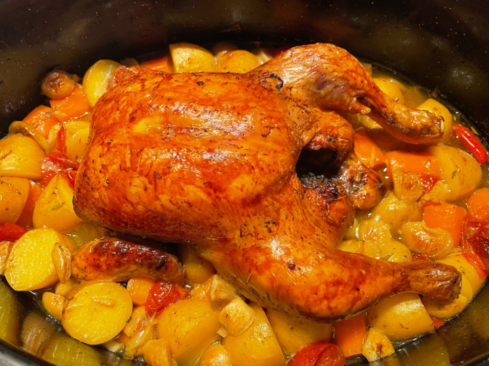 hier superöde todlangweilige maispoularde – mit kartoffeln, knoblauch, karotten, tomaten, s&p, thymian&rosmarin, gartenchili