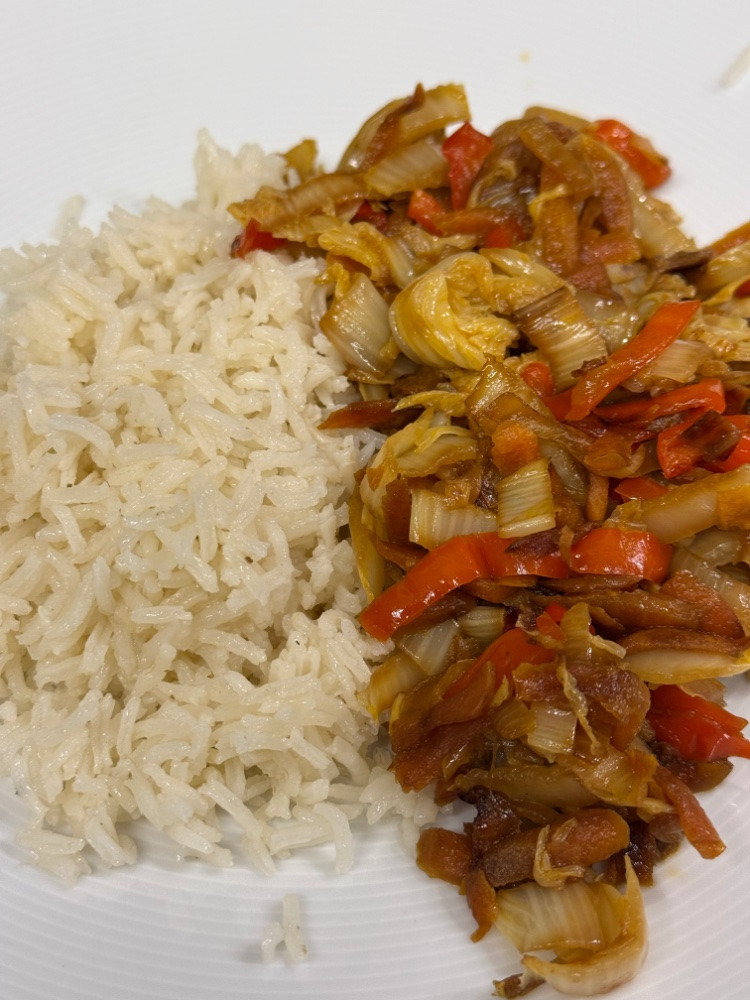 Bei mir gab es Reis mit gedünsteten Gemüse (Chinakohl, Zwiebel, Paprika und Karotte). Selbstverständlich Salat dazu.