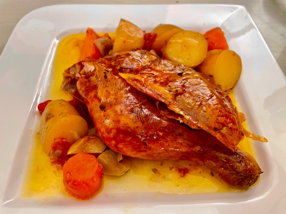 hier superöde todlangweilige maispoularde – mit kartoffeln, knoblauch, karotten, tomaten, s&p, thymian&rosmarin, gartenchili